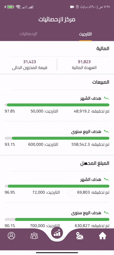 This screen serves as the salesman’s personal performance hub, combining real-time targets and detailed analytics in one place. Through a tabbed interface, users can track their progress toward sales and collection goals, monitor current stock value and cash on hand, and access historical insights. The statistics tab offers comprehensive filtering by time periods—monthly, quarterly, or semi-annually—revealing in-depth breakdowns across payments, orders, visits, and journeys, categorized by every possible status across all modules.