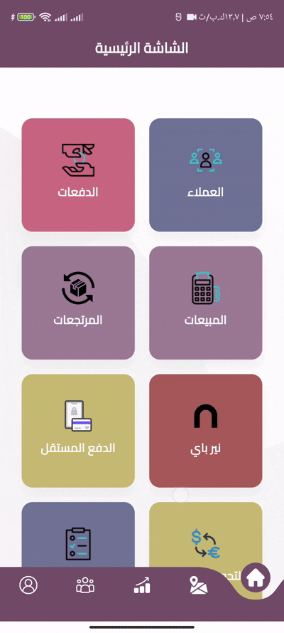 This screen provides quick access to all core modules a salesman needs throughout the day. Presented in a clean grid layout, it includes direct entry points to clients, payments, sales, returns, inventory transfers, and CRM opportunities. It also integrates with NearPay and supports both assigned journeys and real-time delivery invoicing—giving the user a complete operational hub at a glance.