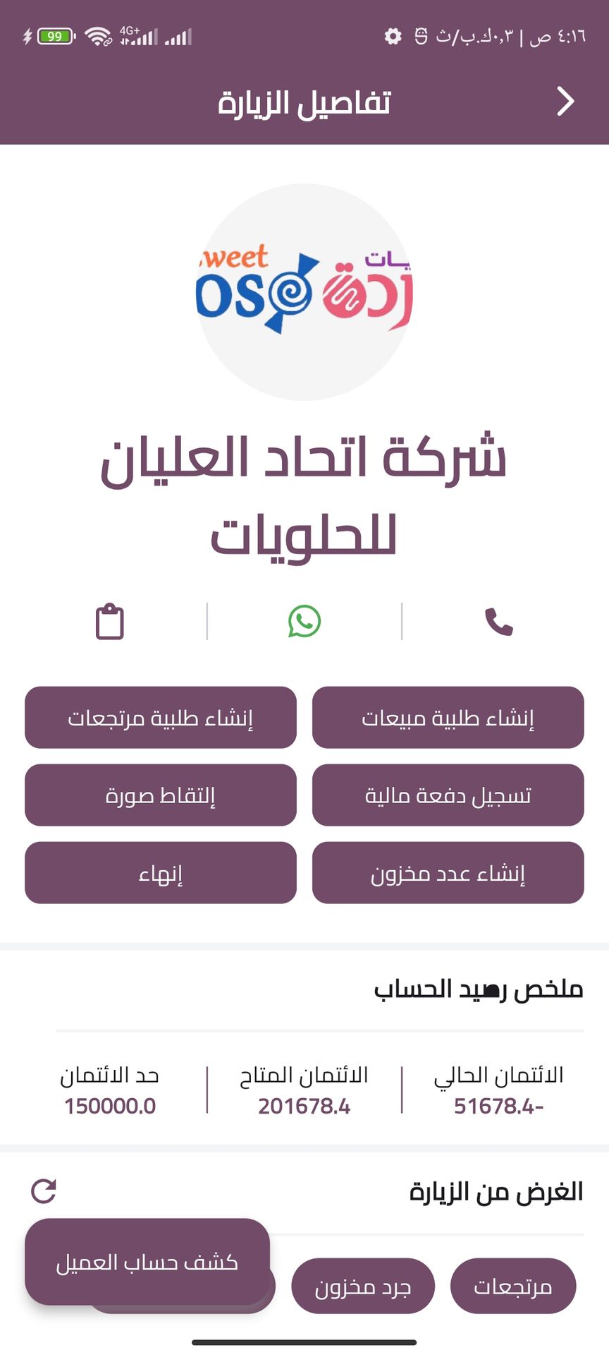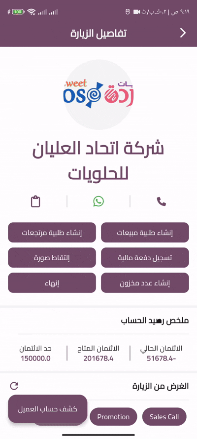 This screen captures the full context of a client visit—combining purpose, account status, and actionable tools in one unified interface. From placing orders and logging returns to recording payments, auditing inventory, and attaching photos, every interaction is tracked with real-time insights. The integrated account summary ensures the salesman is always aware of the client’s credit status, while visit statistics provide instant feedback on outcomes and progress.